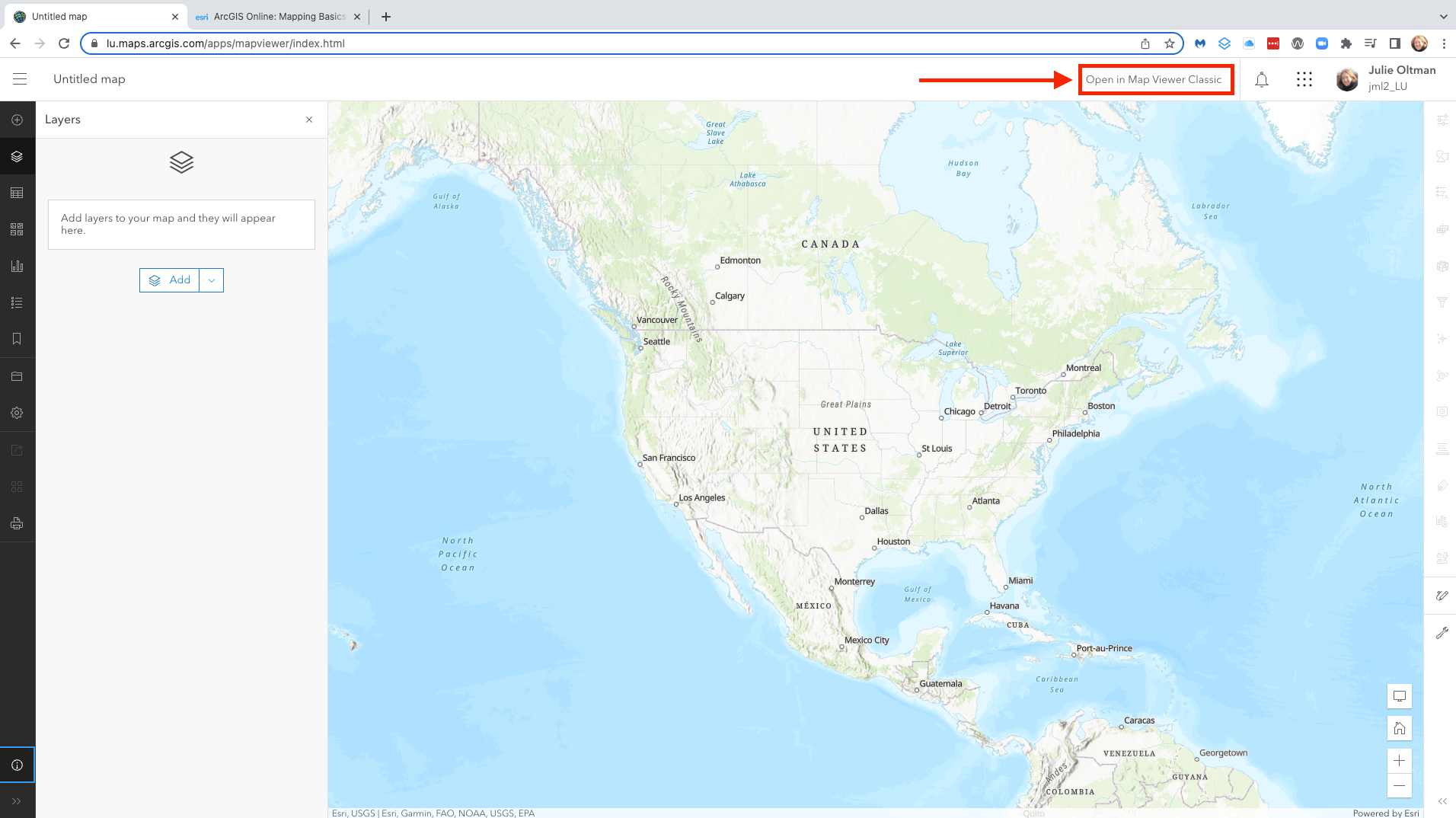 ArcGIS opens a new, clean map in their recently launched a new “Map Viewer”. This new map viewer is still being developed and has some great features however it hasn’t quite replicated all of the functionality in the original “Map Viewer Classic” so we’re going to start with the classic version. It will be easier to learn the new version once you understand the original.