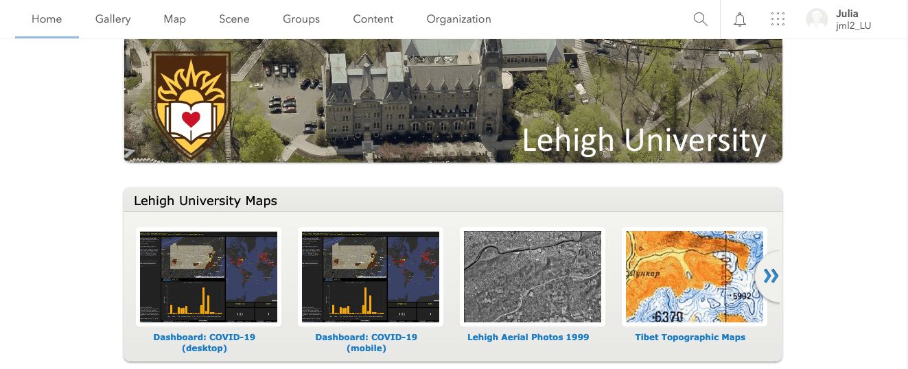 - Log into the Lehigh institutional account: https://lu.maps.arcgis.com/home/