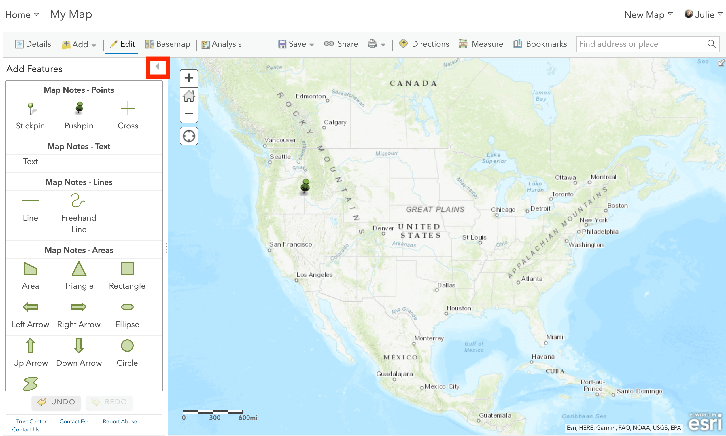 Here, I selected the Push Pin tool and once I placed it on the map, I get a details pop up box where I can add additional info and style my mark.